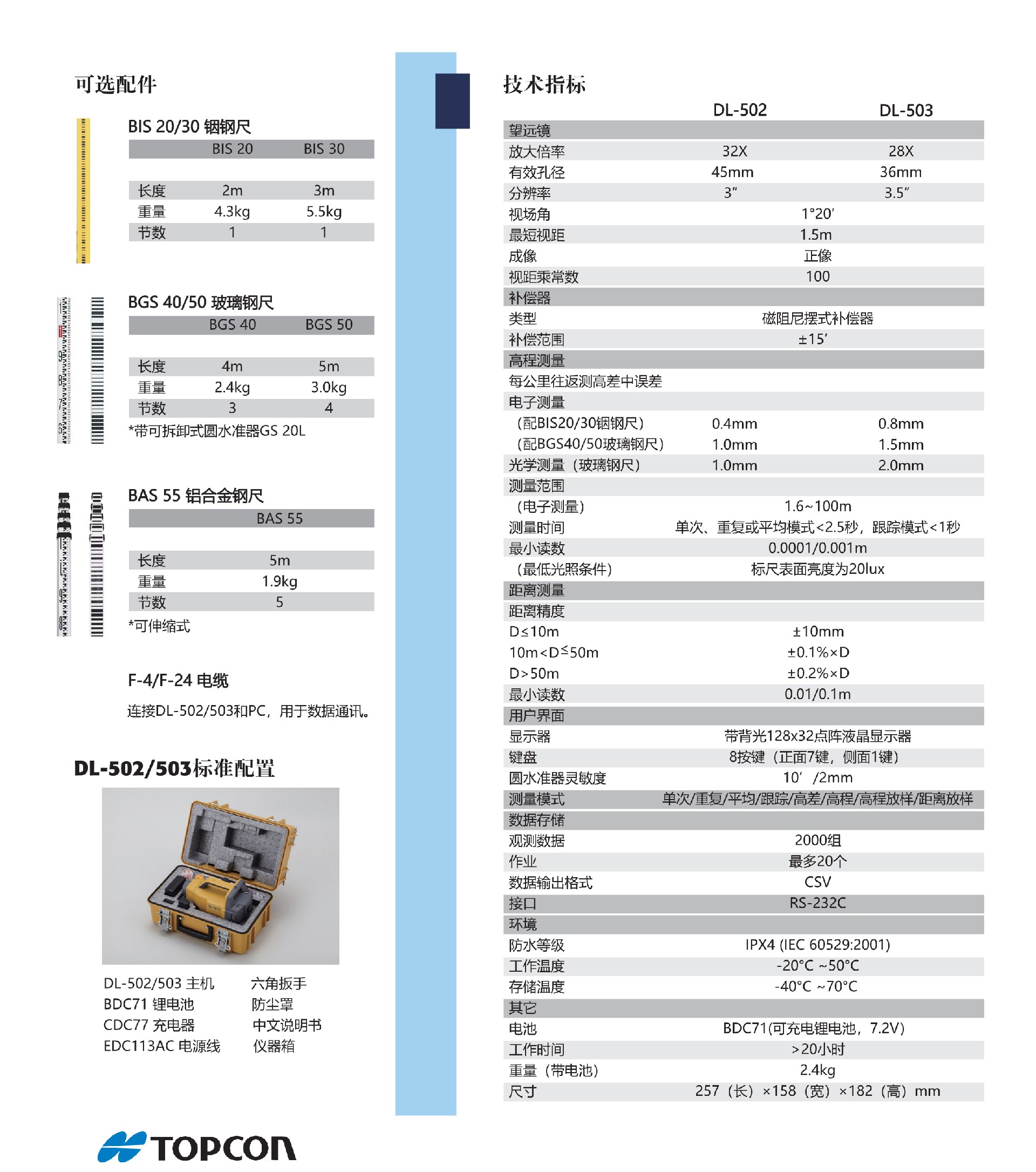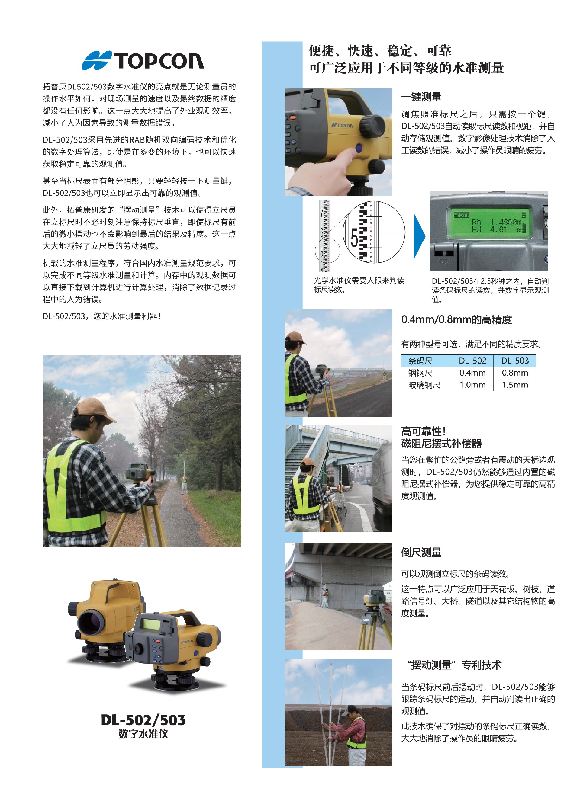 DL502/503数字水准仪可自动识别RAB条码,观测结果比人工读尺更可靠;它操作简单,功能强大,2.5秒即可完成水准测量、记录和计算。让您在外业测量中,事半功倍。