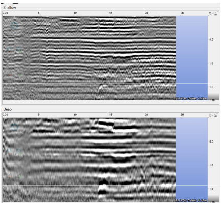 雷达剖面图上表现为,反射波低于前后同一层波形并且局部反射波跳动很强烈,反射能量强弱变化大