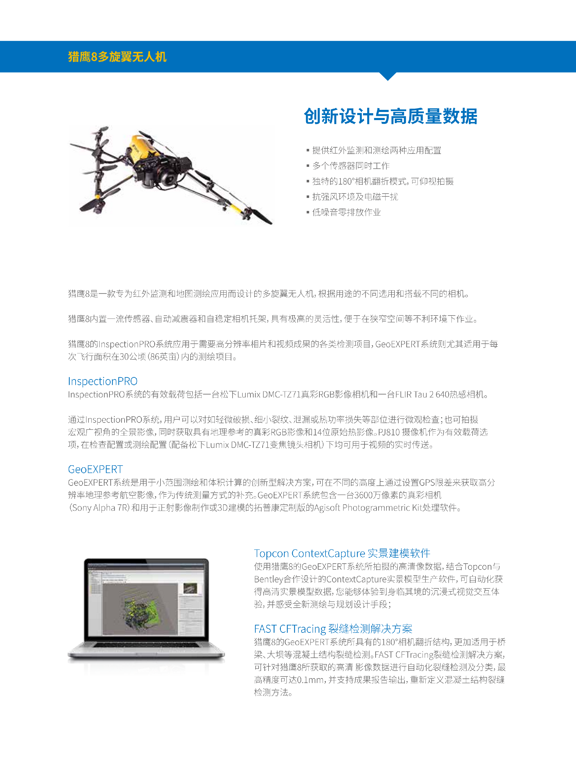●稳:内置多达 31 种传感器,三倍冗余备份,可抗七级风速。●准:可翻折高倍变焦相机全方位工作,实时远距离修改相机拍摄参数?!窨欤?6 米 / 秒飞行速度,10 米 / 秒爬升速度●精:配合结构物检测软件自动分析提取0.1mm裂缝